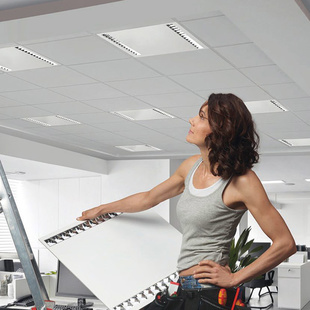 Mit ihrem matt-weißen Gehäuse aus pulverbeschichtetem Metall integriert sich die Sonis EVO unauffällig in alle hellen Deckenflächen. Dank Darklight-Effekt punktet sie durch unaufdringliche Präsenz und erzeugt ein blendfreies, normgerechtes Arbeitslicht.